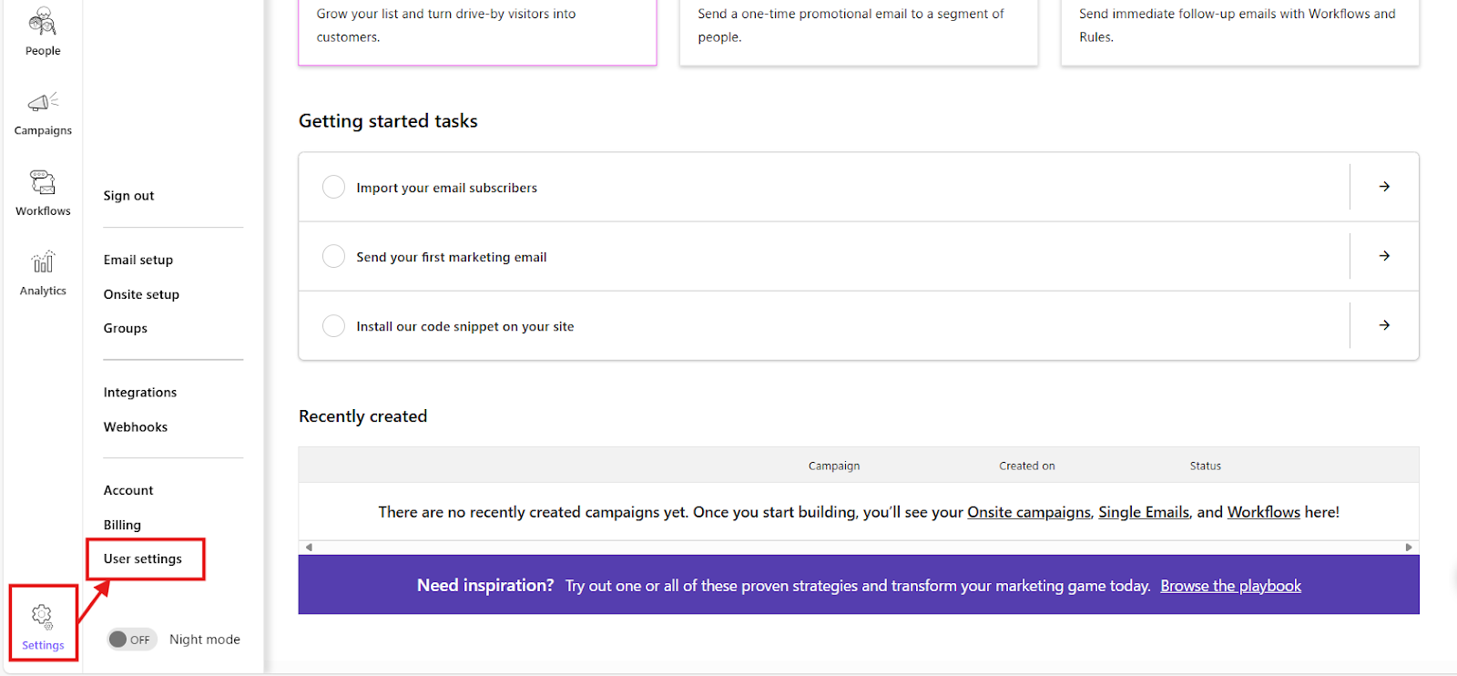 - Dripにログインし、左下の「Settings」から「User settings」にアクセス。