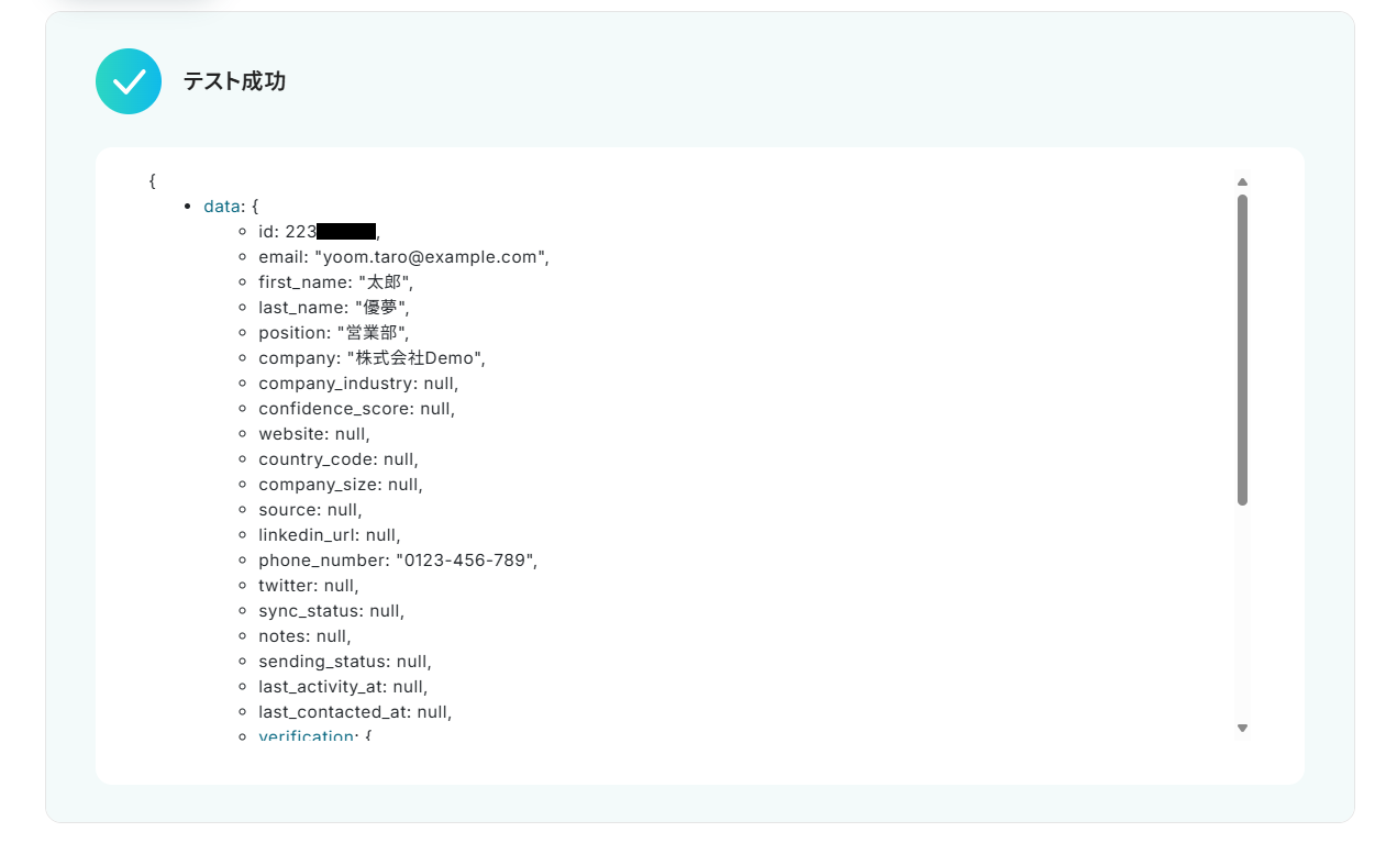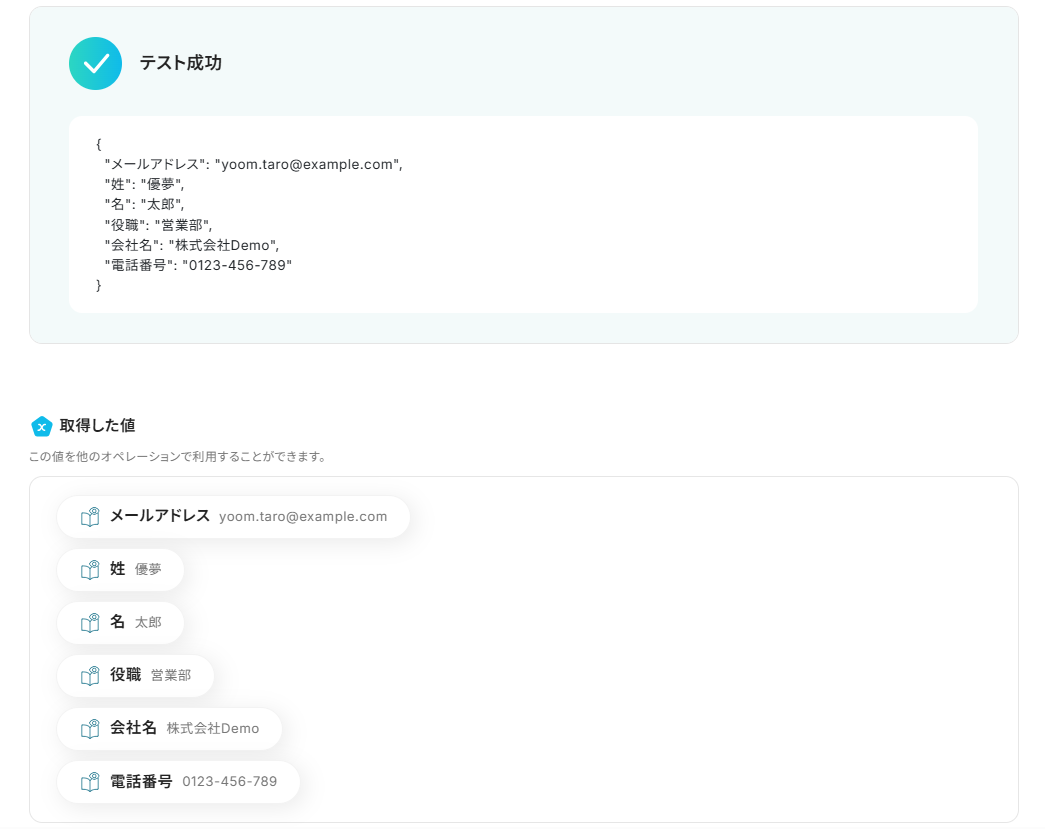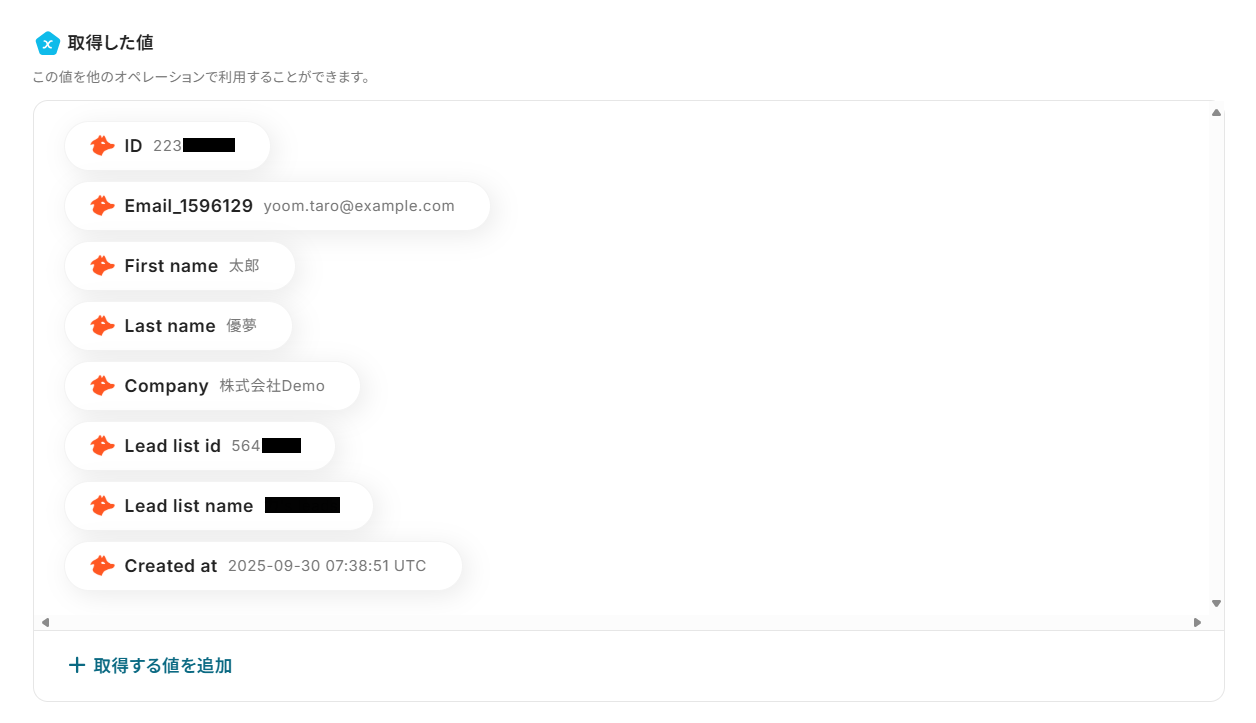 テストに成功すると、「取得した値」に作成したリードの各情報が追加されます。