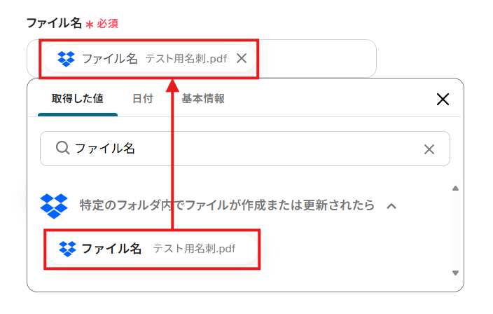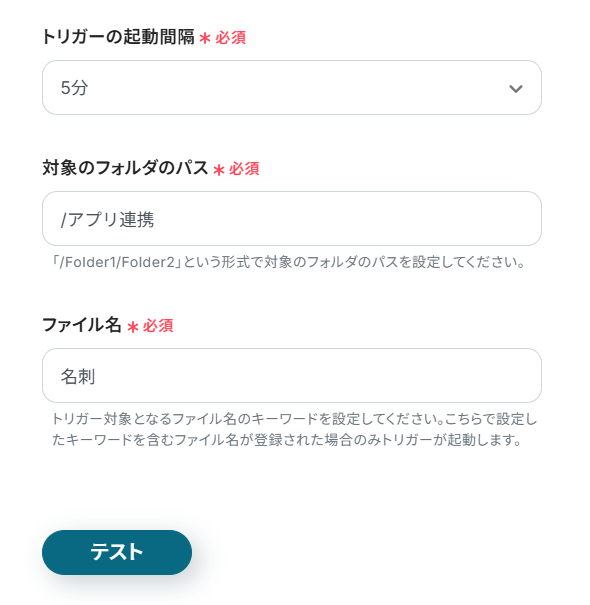 「フォルダのパス」には、トリガーアクションと同一のパスを設定してください。 「ファイル名」にはデフォルトで、トリガーアクションで取得したファイル名が設定されています。 項目を消してしまった場合には、入力欄クリック時に表示されるトリガーアクションメニューから「ファイル名」を選択してください。