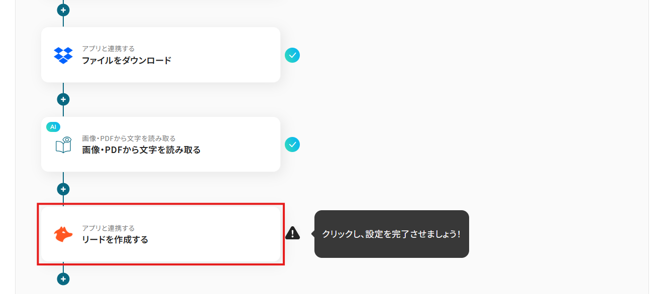 Dropboxで特定のフォルダ内でファイルが作成されたら、OCRしてHunterにリードを作成する Dropboxのフォルダと、連携させたいファイルに含まれるキーワードを指定して、その条件に合うファイルがアップロードされた際にリード作成を行うフローです。