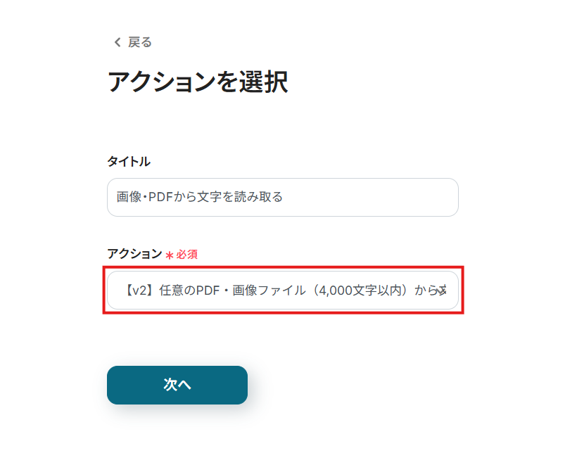 「タイトル」を任意で変更。 目的に応じて「アクション」をプルダウンから選択。 このフローで使用する「任意のPDF・画像ファイルから文字情報を読み取る」は、文字数によって消費するタスク数が変わります。 4,000字(5タスク)・8,000字(10タスク)・12,000字(15タスク)から任意のアクションを選択してください。※ YoomのOCR機能では、アクション記載の規定の文字数を超えるデータや、文字が小さすぎる場合に正しく読み取れないことがあります。 文字数や文字の大きさには少し余裕を持たせてご利用ください。