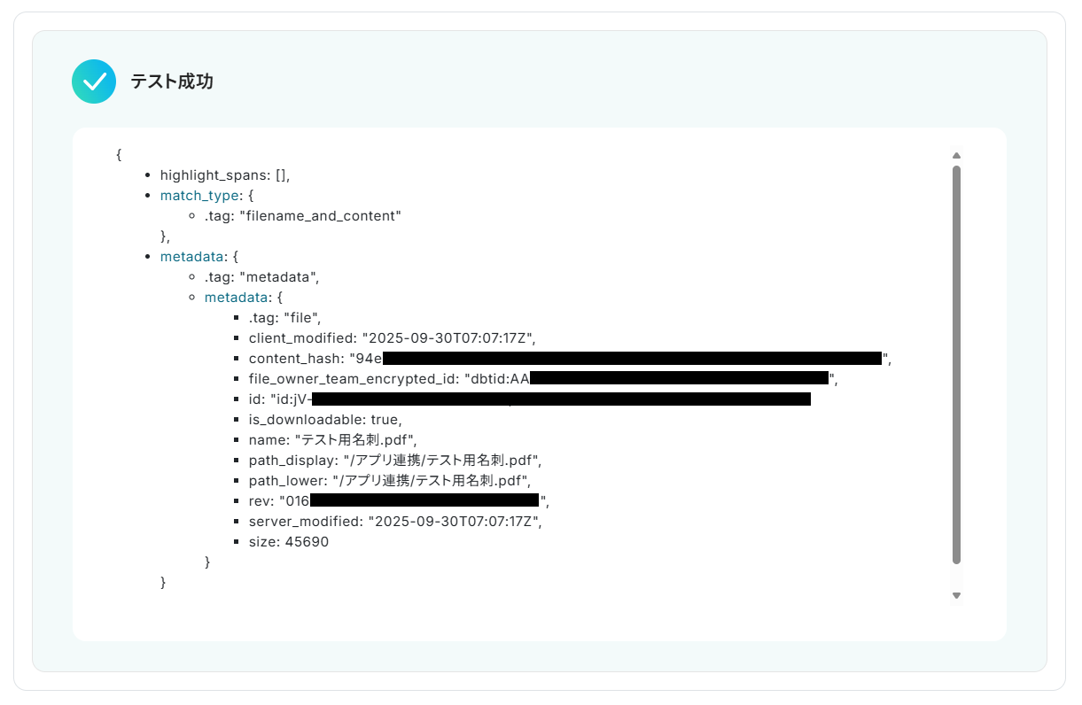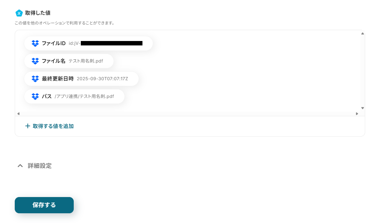 フローボットの「テスト」をクリック。 テストに成功すると、「取得した値」にアップロードされたファイルの情報が追加されます。 これらの値は、以降のアクションで動的な値(フローが稼働する度に更新される値 )として使用可能です。 詳しい説明は、こちらのヘルプページ をご覧ください。