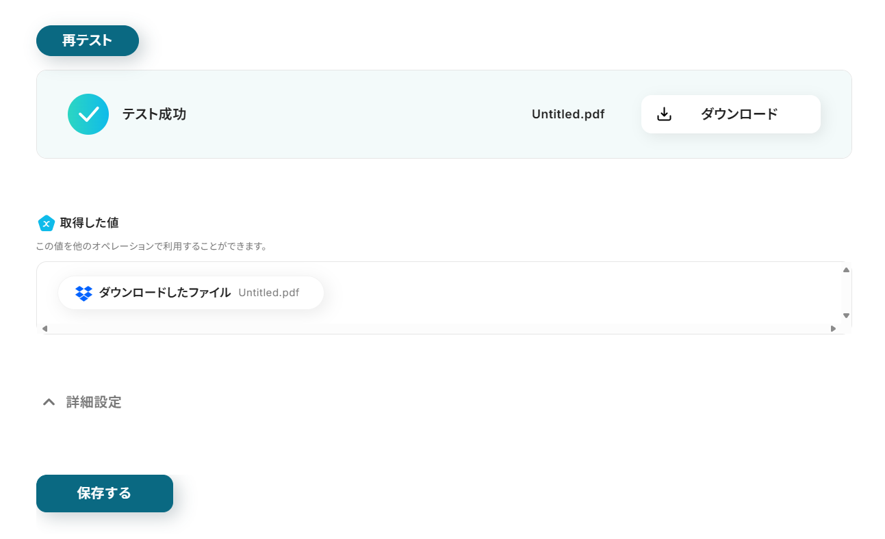 テスト用にアップロードしたファイルが取得できていることを確認し、ページ下部の「保存する」をクリック。 トリガー設定が完了し、アクションの選択画面に戻ります。