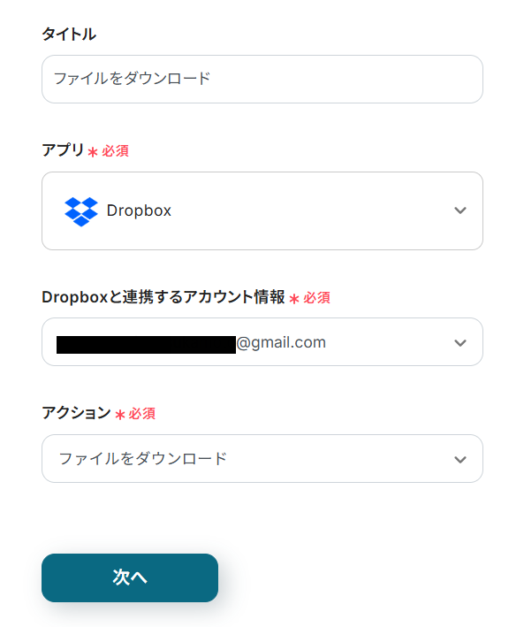 「タイトル」は任意の名称に変更できます。 アクションの内容が分かりやすいタイトルにするとよいでしょう。 連携アカウントにはマイアプリ登録で連携したアカウントが設定されています。 複数のアカウントと連携している場合には、このフローで用いるアカウントをプルダウンから選択してください。 アクションを確認して、「次へ」をクリック。