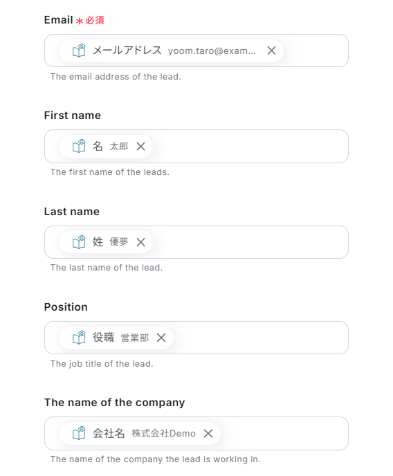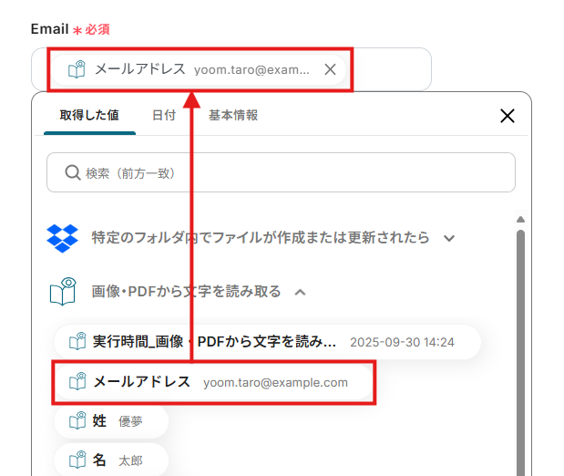リードの各項目に、これまでに取得した値を設定していきましょう。 入力欄クリック時に表示されるOCRアクションのメニューから、該当する項目を選択してください。 項目をクリックすると、入力欄に{{項目名 追加された値}}という形で追加されます。 ※ この動的な値を使用せずに固定テキストで設定してしまうと、フローが稼働する度に同じリードが作成されてしまうためご注意ください。