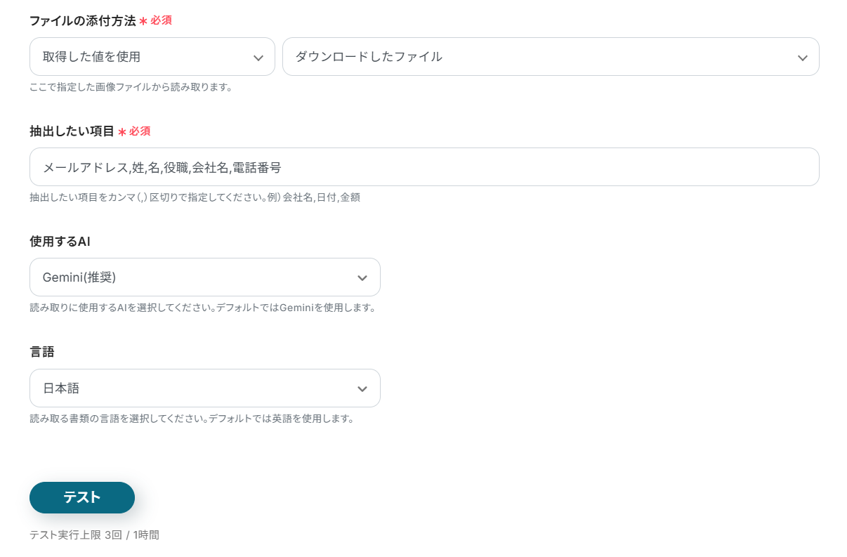「次へ」をクリック。 OCRの対象となるファイルを設定する「ファイルの添付方法」には、デフォルトで「取得した値を使用」と「ダウンロードしたファイル」が設定されています。 ※ ステップ4でダウンロードしたファイルです。 「抽出したい項目」に、リード作成で使用する項目を設定。Hunterのリード作成において「メールアドレス」は必須項目 となります。 「使用するAI」を「Gemini(推奨)」「ChatGPT」「Claude」「Claude_v2」から選択。 参考:OCR:AIモデルの違いについて 読み取るファイルの「言語」を「日本語」「英語」から選択。 設定を終えたら「テスト」をクリック。