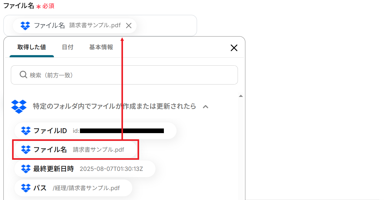 フォルダのパス・ファイル名には、ステップ3で取得したアウトプットが以下のように引用されて予め設定されています。