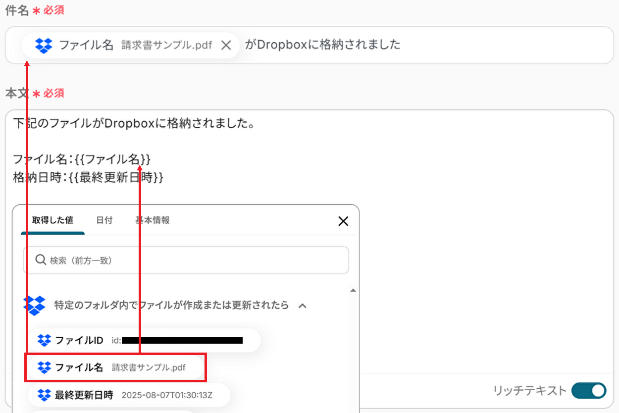 固定の文章や、Dropboxから取得したアウトプットなどの変数を組み合わせて自由にカスタマイズできます。