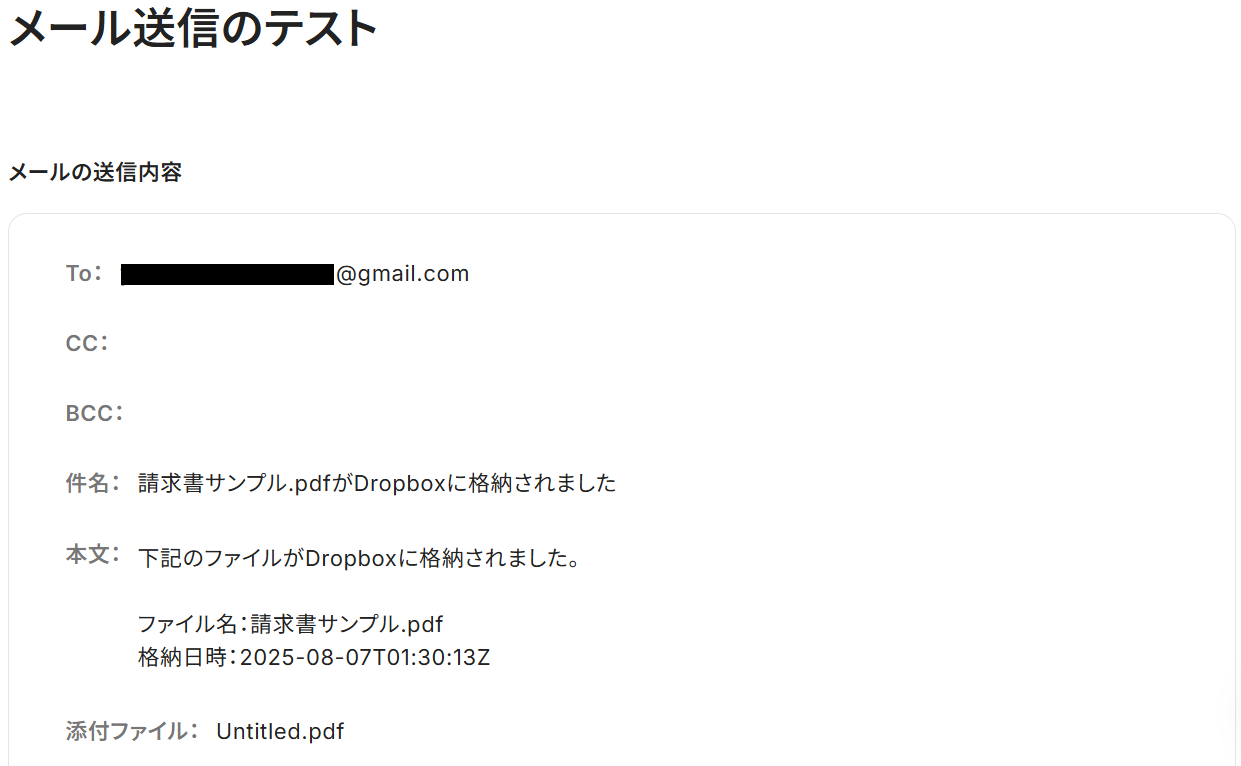 メール送信のテスト画面に移るので、内容に誤りがないか確認してテストしてください。