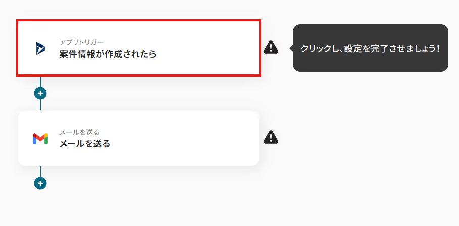 先ほどの画面で「OK」をクリックして、表示された画面のアプリトリガー「案件情報が作成されたら」をクリックしましょう。