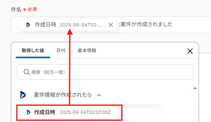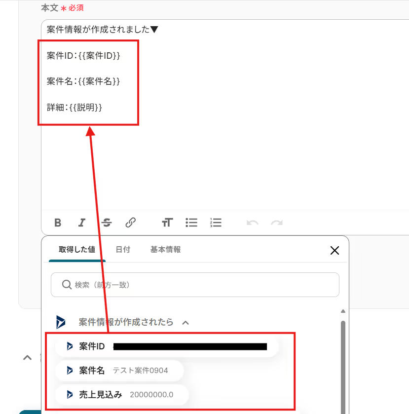 「本文」は、入力欄をクリックして表示される取得した値を引用し入力しましょう。
