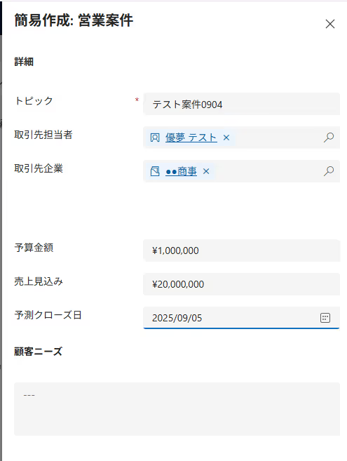フローの作成を始める前に、あらかじめYoomと連携するMicrosoft Dynamics365 Salesに、案件を作成しておきましょう!
