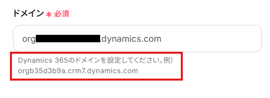 4.「ドメイン」は、入力欄下の注釈を参考にして、Microsoft Dynamics365 Salesの画面のURLから取得して、入力しましょう。