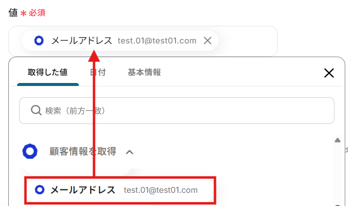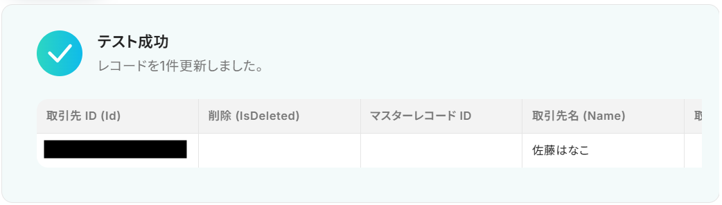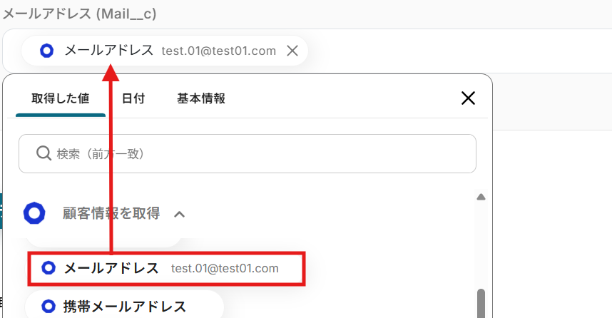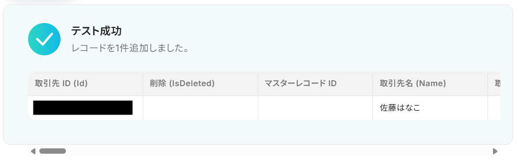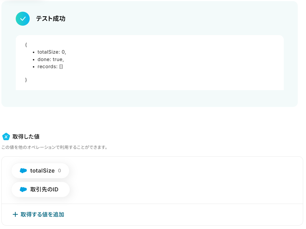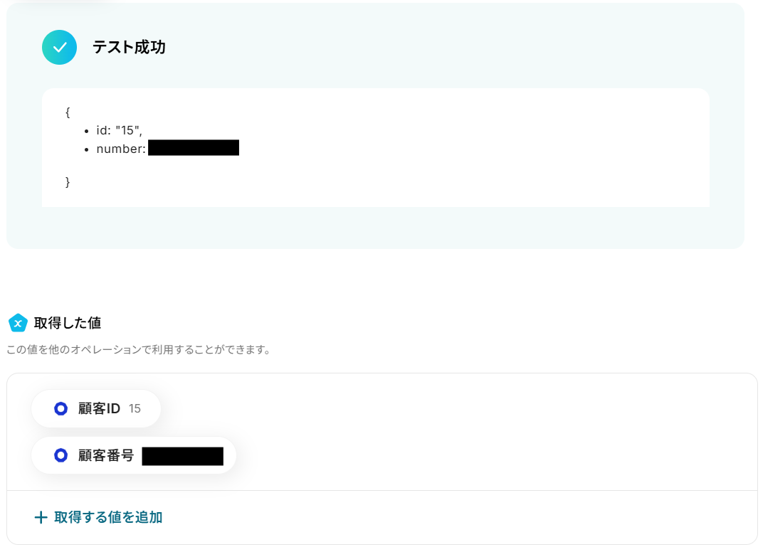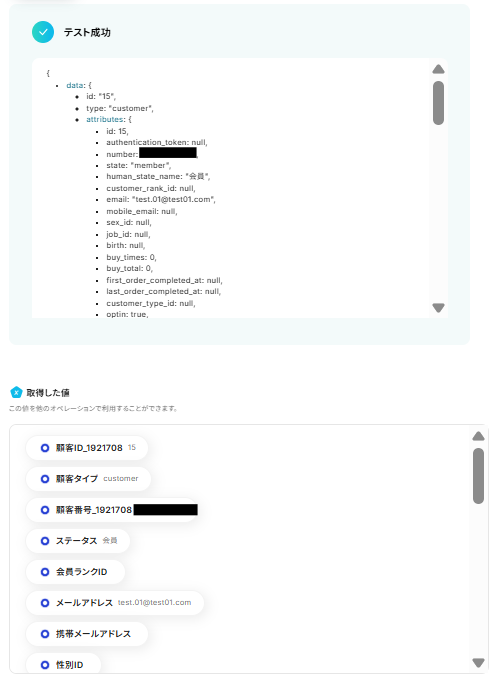 テストが成功すると取得した値の横に、ecforceで作成した顧客情報が表示されます。