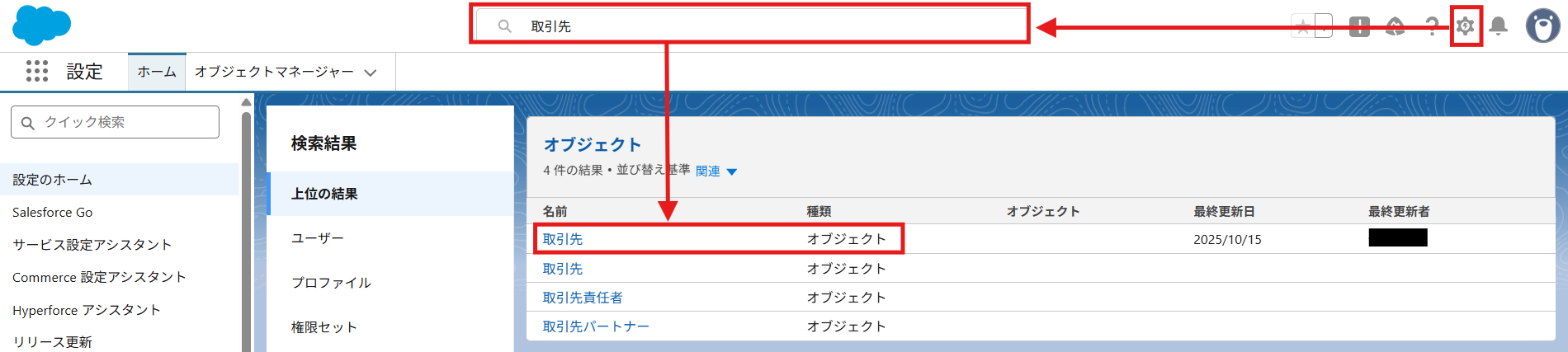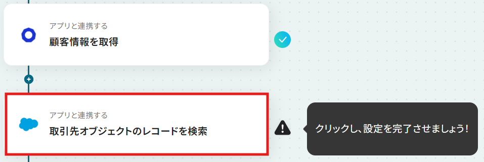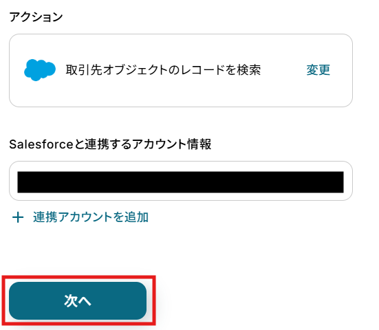 - 次に、Salesforceの「取引先オブジェクトのレコードを検索」アクションで、該当の顧客情報が既に存在するかを確認します。