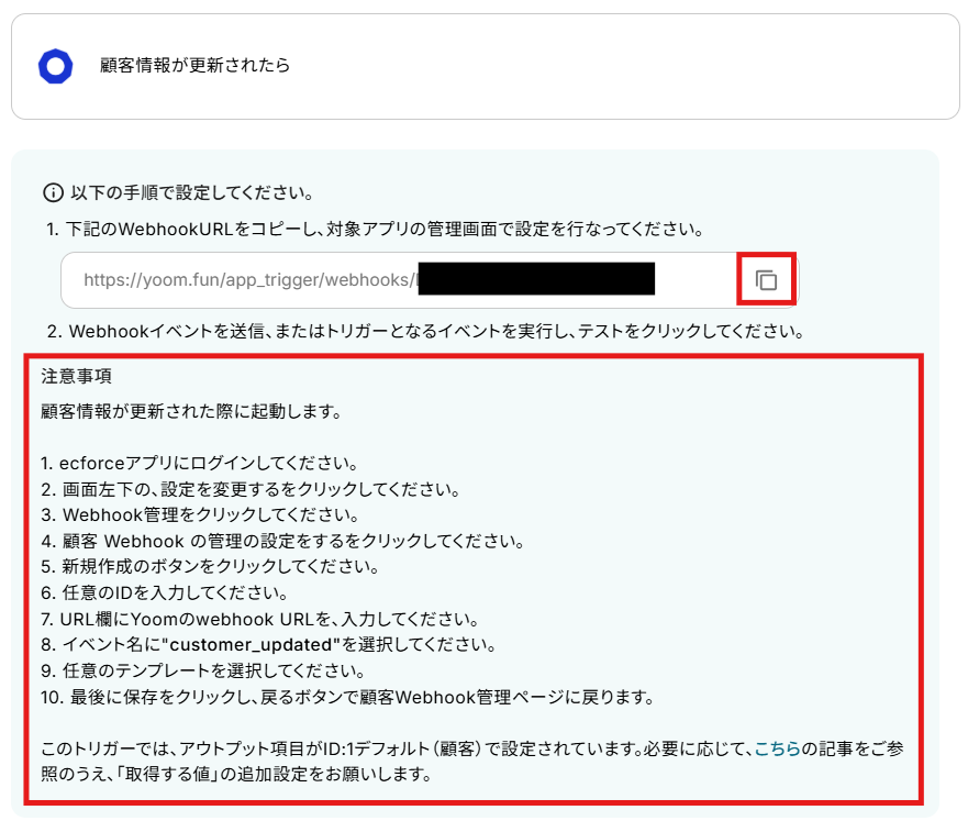 赤枠内のWebhook URLをコピーして、ecforceに移動してください。