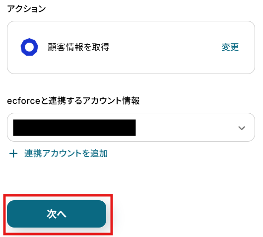 - 続いて、オペレーションでecforceの「顧客情報を取得」アクションを設定し、更新された情報を取得します。