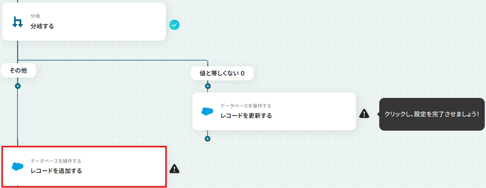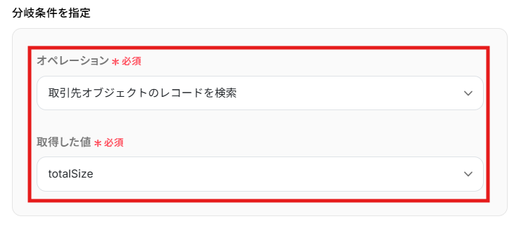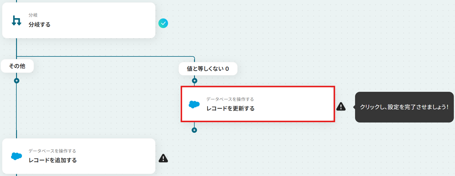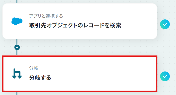 - 分岐機能を設定し、Salesforceにレコードが存在する場合としない場合で処理を分けます。