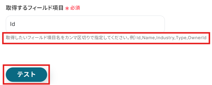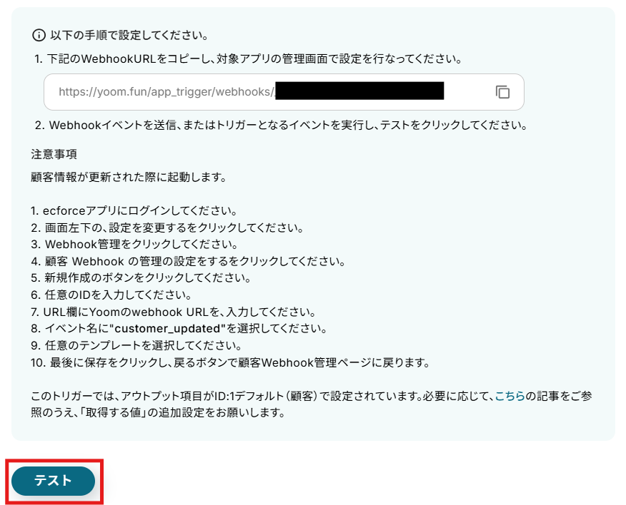 テスト用の顧客を作成したら、Yoomの操作画面に戻り、「テスト」をクリックします。