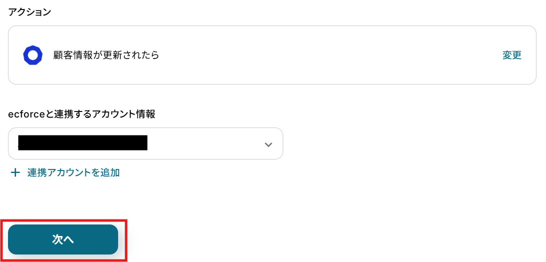 - 次に、トリガーでecforceを選択し、「顧客情報が更新されたら」というアクションを設定します。