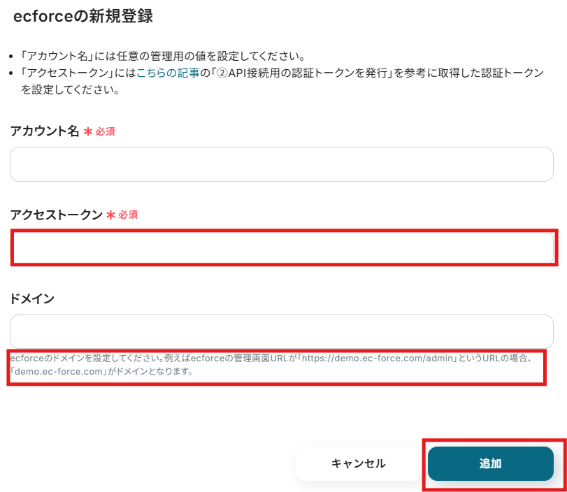 ecforce公式ページの「②API接続用の認証トークンを発行」を参考にして、認証トークンを発行し、赤枠内に貼り付けてください。