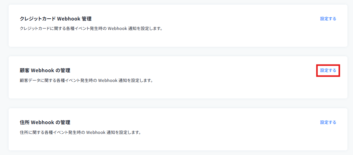 「顧客Webhookの管理」の「設定する」をクリックしてください。