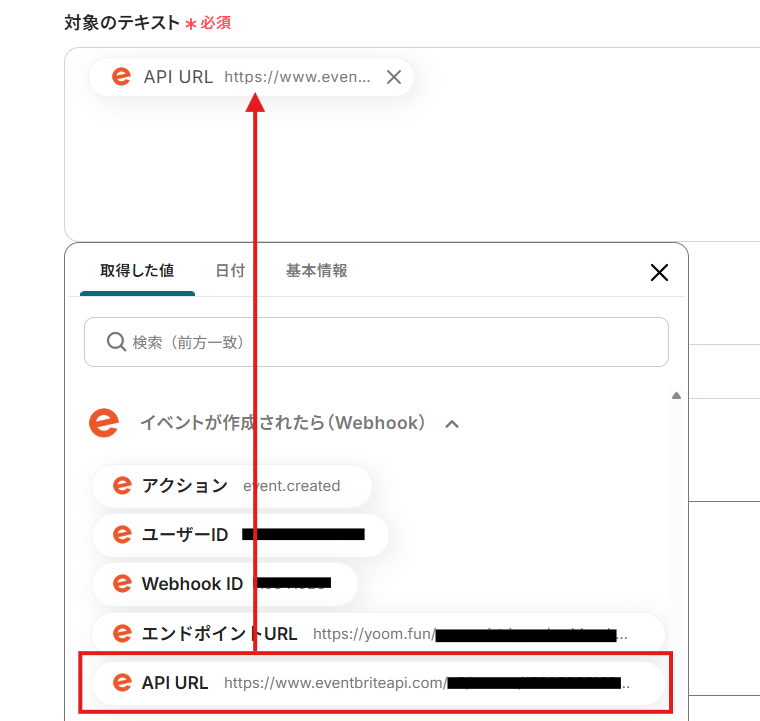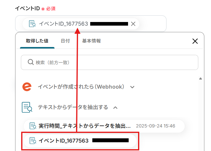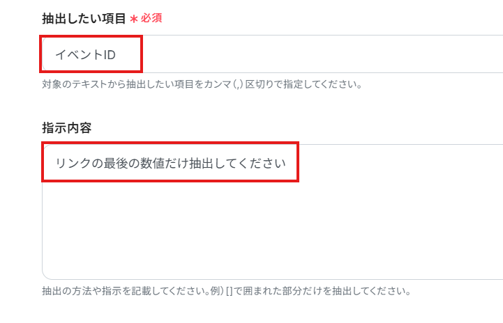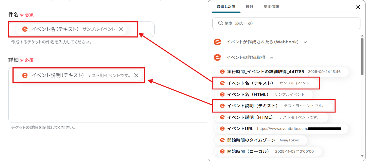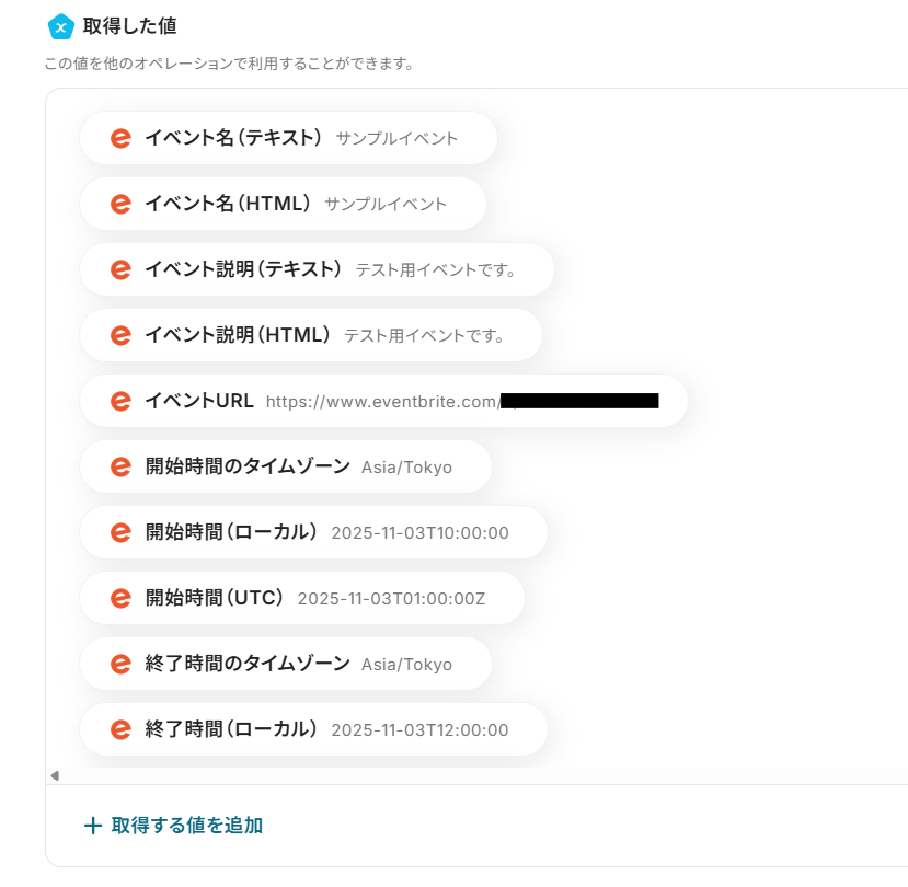 これらの入力欄には、固定値を直接指定することも、Eventbriteのイベントから抽出したアウトプットを割り当てることも可能です。