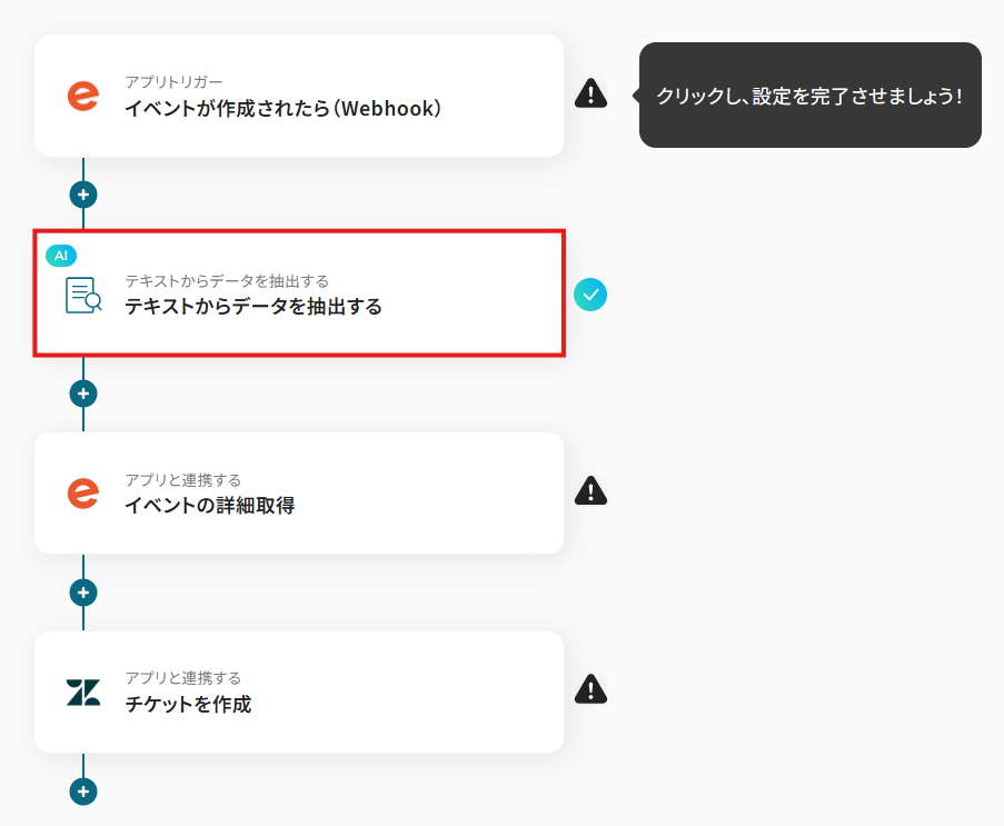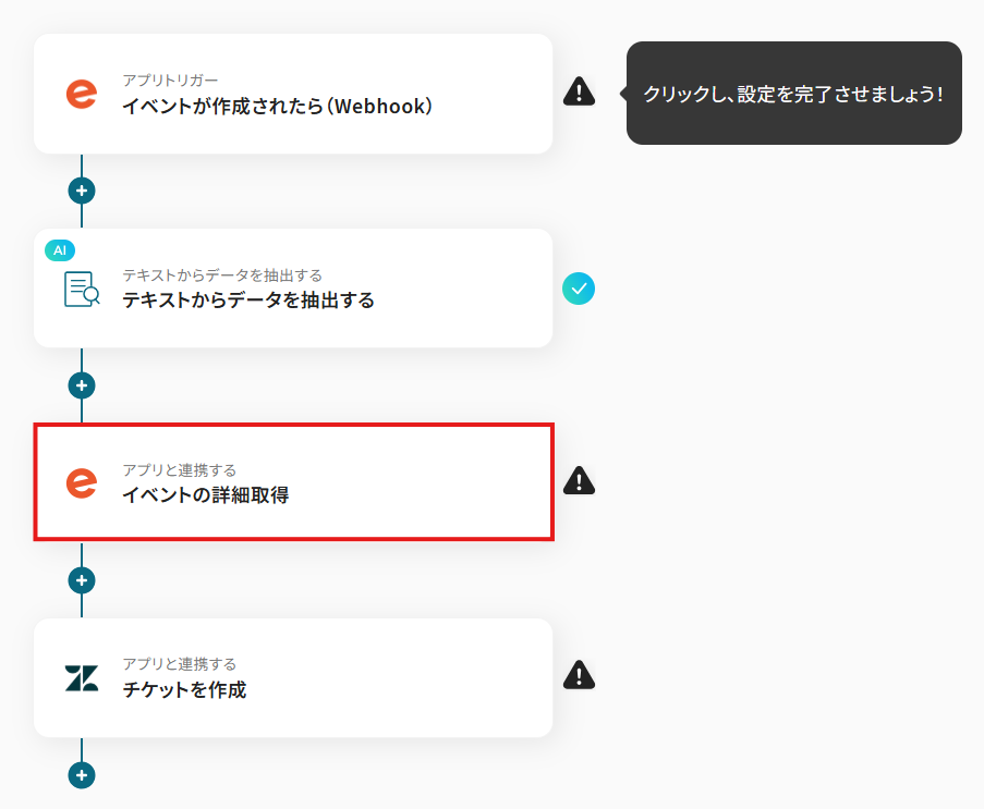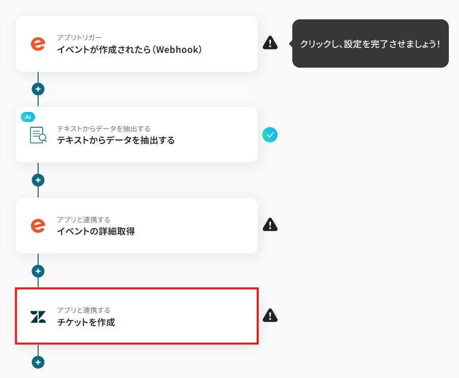 例えば、イベント名に「セミナー」というキーワードが含まれている場合のみチケットを作成するといった条件分岐を設定できるため、サポートチームが対応すべき重要なイベント情報だけを自動で共有でき、チケット管理の効率化に繋がります。