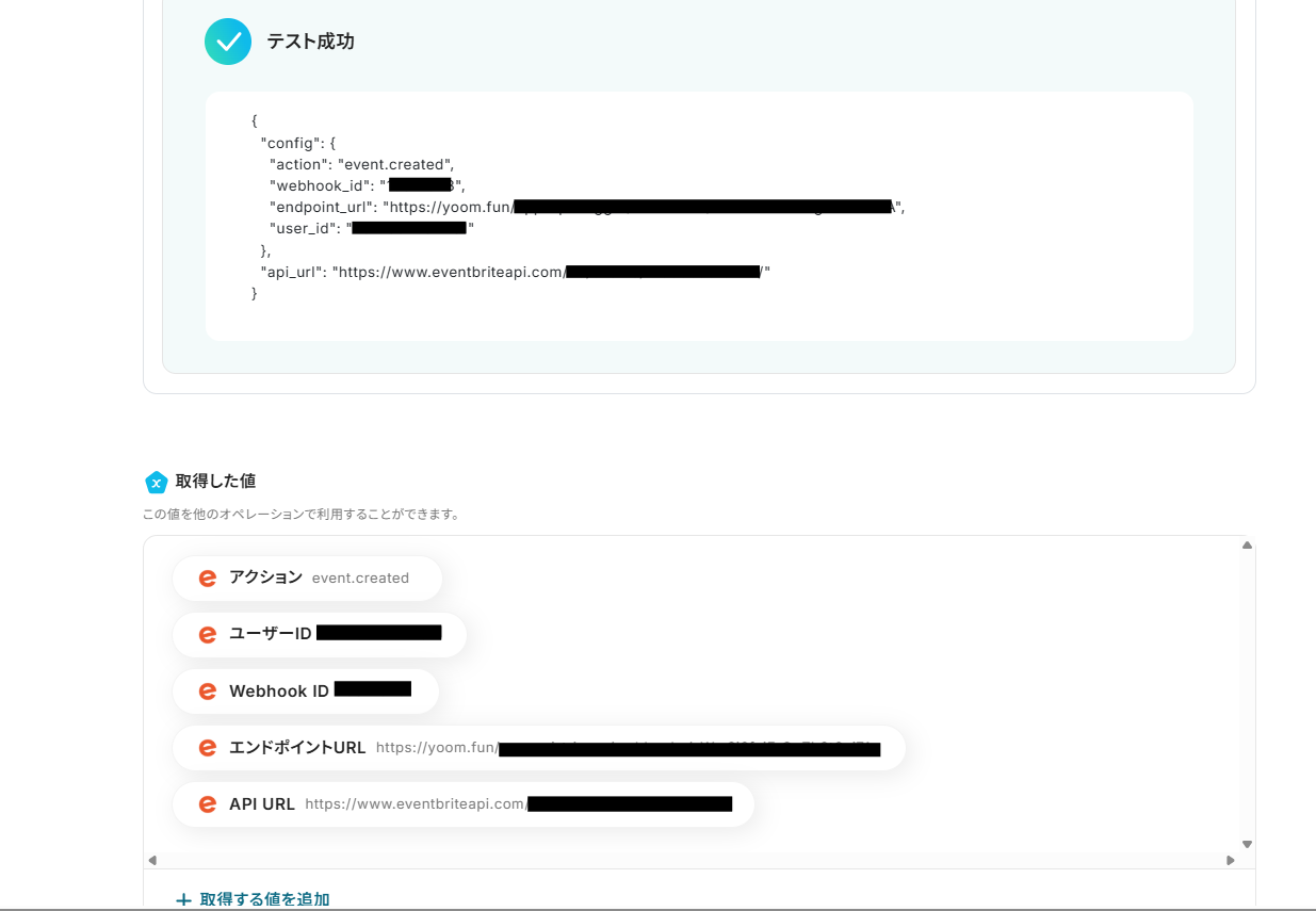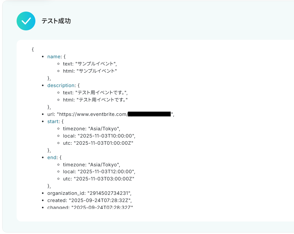 4.次はEventbriteで、登録したWebhookが正常にトリガーアクションを検知できるかのテストを行います。