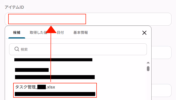 タスク名のループ変数がデフォルトで設定されていますが、以下のように入力欄をクリックし取得した値から設定することも可能です。