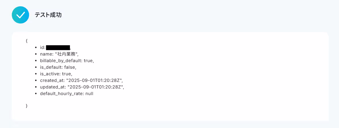 テストに成功するとテスト成功画面が表示され、Harvestにタスクが追加されますので確認しておきましょう。