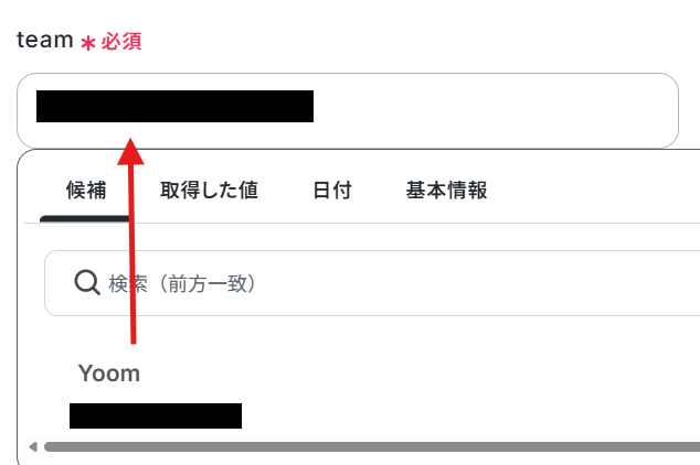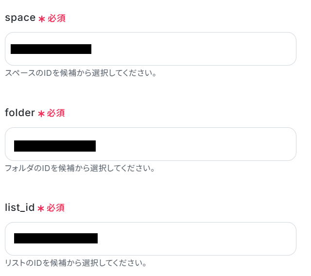 team・space・folder・list_idは、該当の入力欄をクリックして表示される候補の中から、使用したい項目を選択してください。