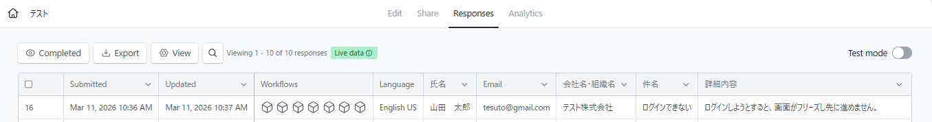 今回は、フォームの送信がトリガーになるため、テスト用にフォームを送信してください。(架空の設定でOKです!)