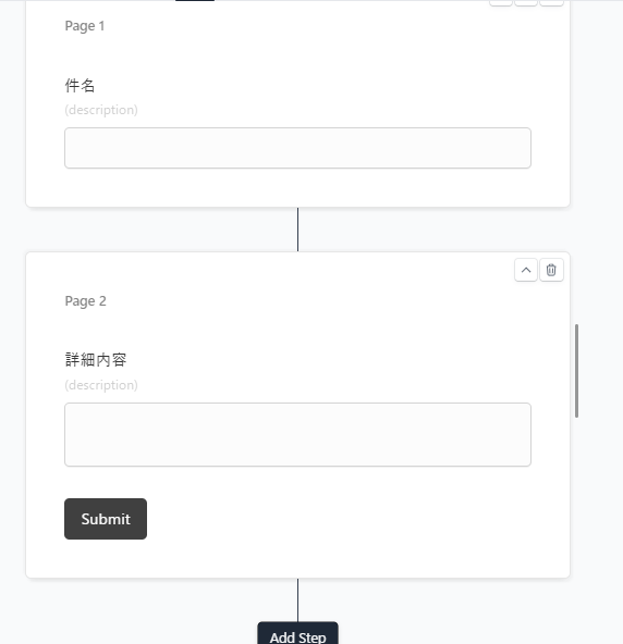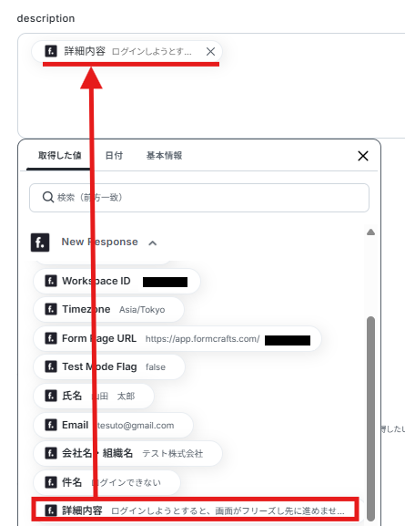 descriptionも同様に、FormCraftsに回答された「詳細内容」が自動引用されるようにデフォルトで設定されています。