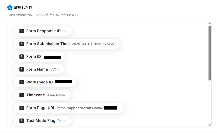 - 各フィールドには、トリガーであるFormCraftsで取得した回答内容(氏名、問い合わせ内容など)を引用し、動的に情報を反映させることが可能です