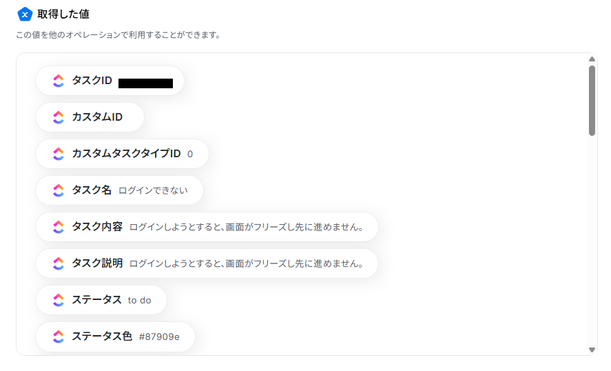 - ClickUpの「タスクを作成する」オペレーションでは、タスク名、説明、担当者、期日などを任意で設定してください