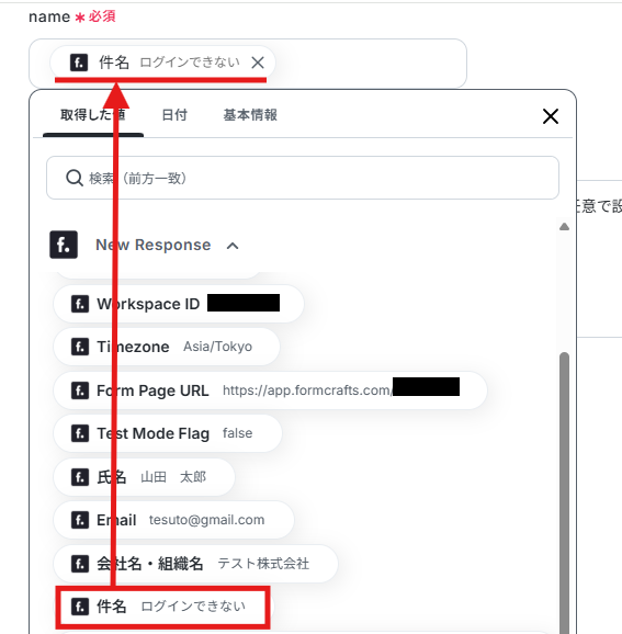 nameの設定は、FormCraftsのフォームに回答された「件名」が自動で引用されるように設定されています。