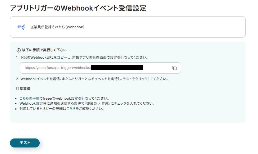 Webhookの設定画面が表示されるので、freee人事労務で設定を行いましょう。