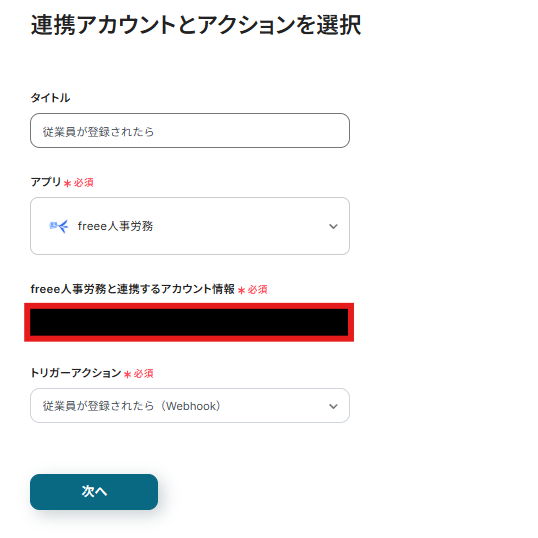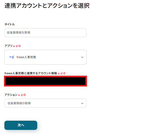 連携アカウントとアクションを選択する画面が表示されるので、今回連携するfreee人事労務のアカウントを確認し「次へ」をクリックします。