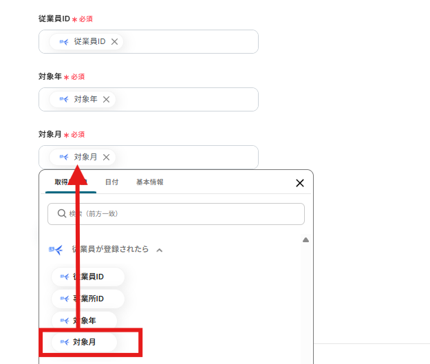 従業員ID、対象年、対象月は以下のように取得した値から必要な値を入力します。