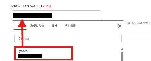 投稿先のチャンネルIDには以下のように、表示される候補から選択し入力しましょう。