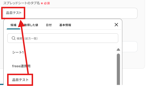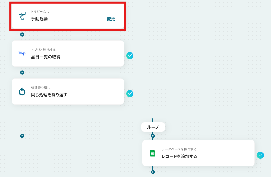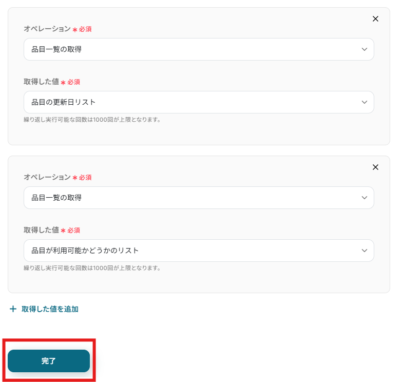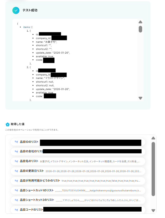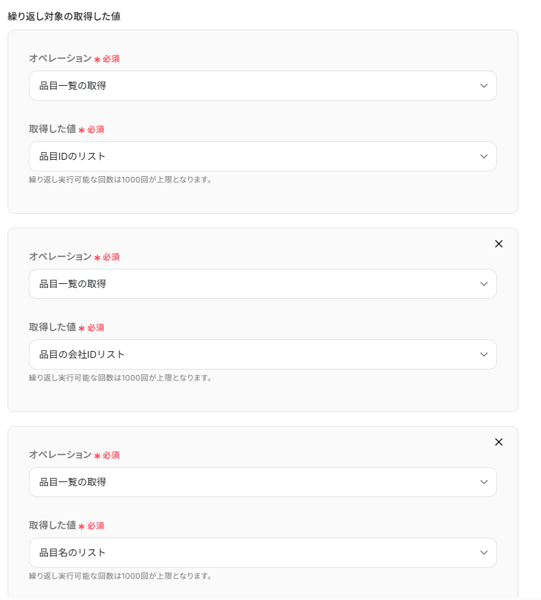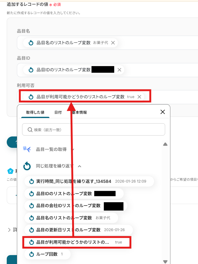 - ループ機能では、前段のfreee会計で取得した品目一覧の情報の中から、繰り返し処理をしたい値を任意で設定してください