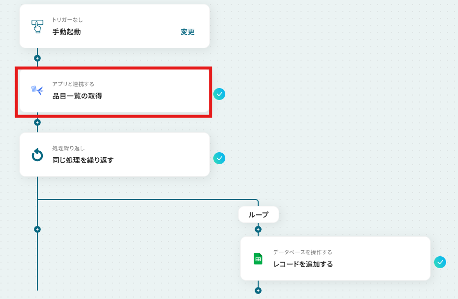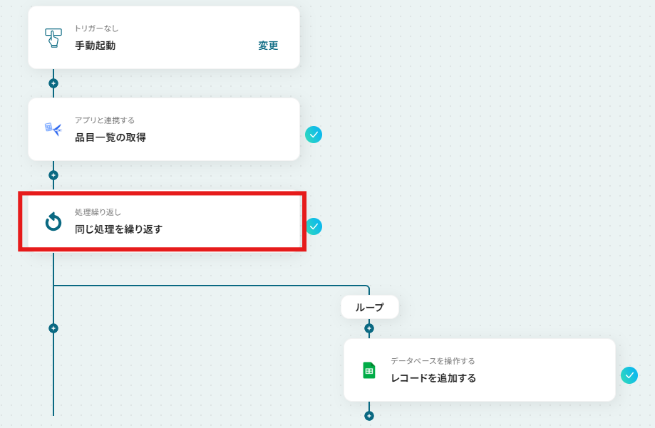 - 次に、取得した品目一覧の情報を1件ずつ処理するため、オペレーションで「同じ処理を繰り返す」ループ機能を設定します