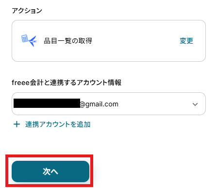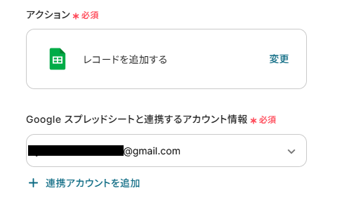 アクションはデフォルト設定のまま、アカウント情報は、連携したいアカウントが選択されているか確認してください。