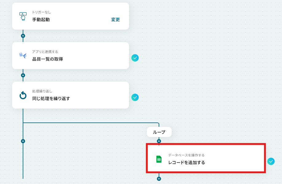 - 最後に、ループ処理の中でGoogle スプレッドシートの「レコードを追加する」アクションを設定し、品目データを1行ずつ追加します
