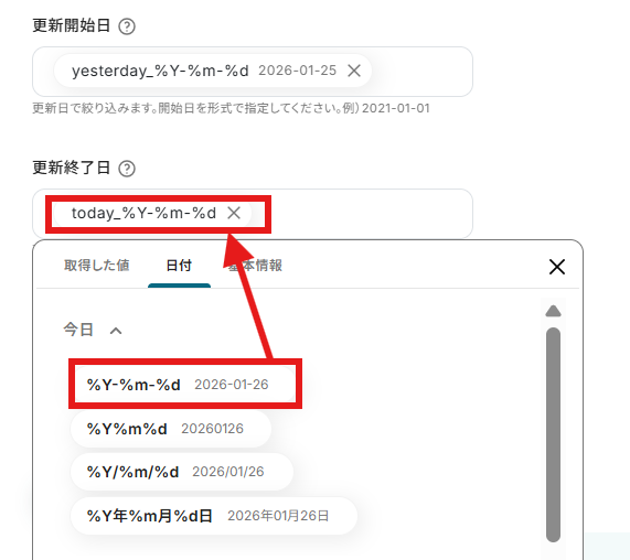 今回更新開始日は「日付」の項目から昨日、更新終了日は「日付」の項目から今日を入力しました。