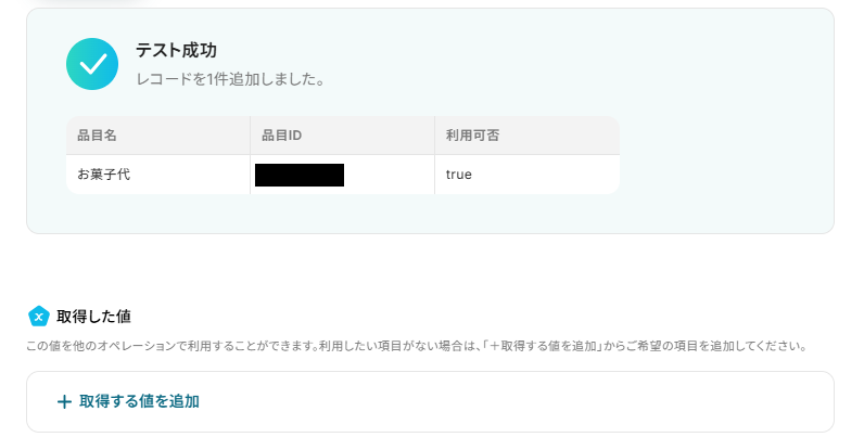 追加するレコードの値は、それぞれ以下のように取得した値から入力してください。