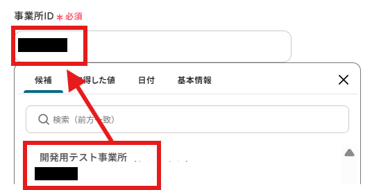 候補、もしくは画面注釈に沿って「事業所ID」を入力します。