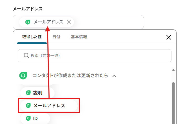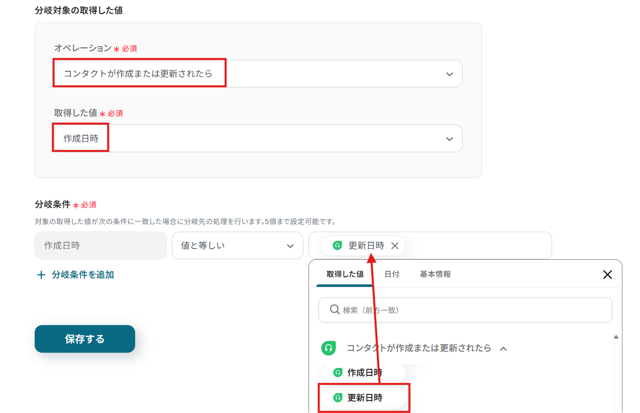 オペレーションに「コンタクトが作成または更新されたら」、取得した値に「作成日時」が設定されていることを確認します。