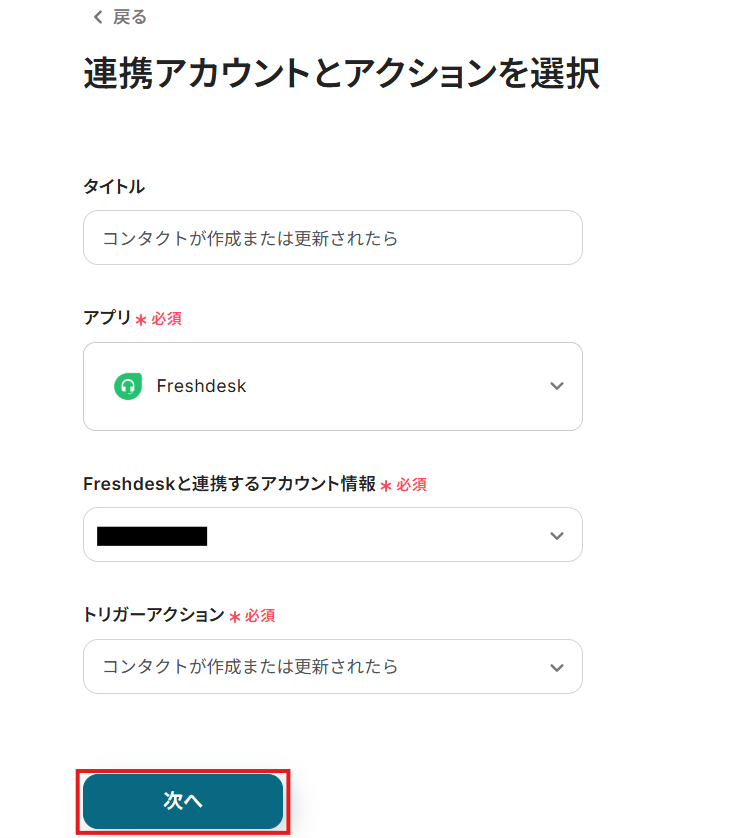 トリガーアクションはそのままにして、「次へ」をクリックしてください。